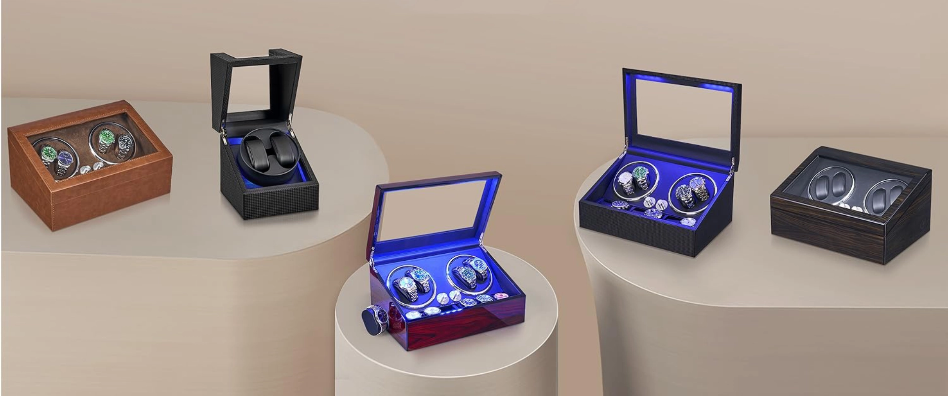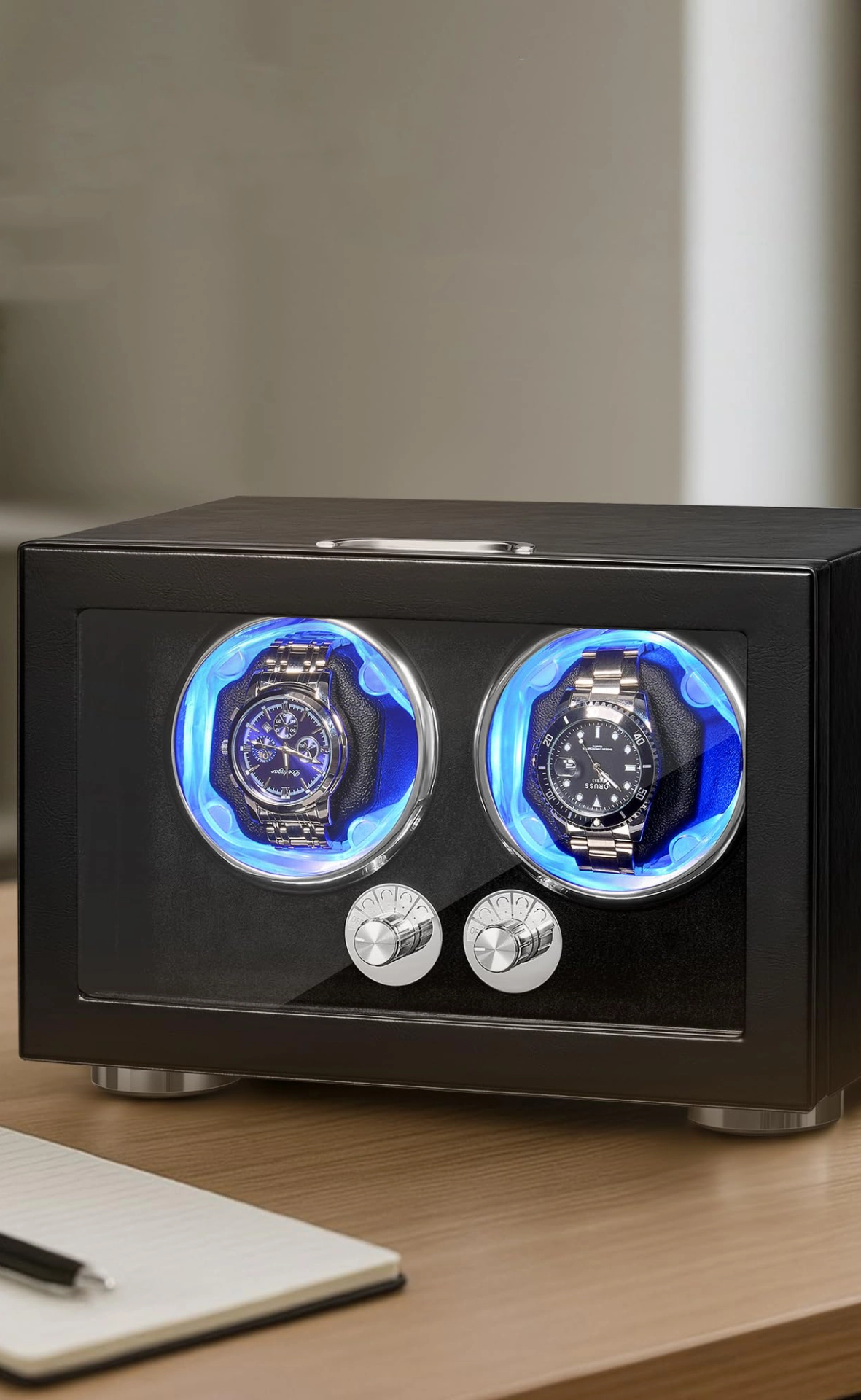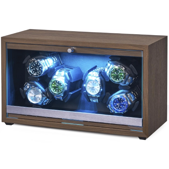 Luxury watch winder with 4 rotators and 6 storage slots. Features super quiet Mabuchi motor, LED backlight, piano paint finish, and 4 rotation modes—perfect gift choice.