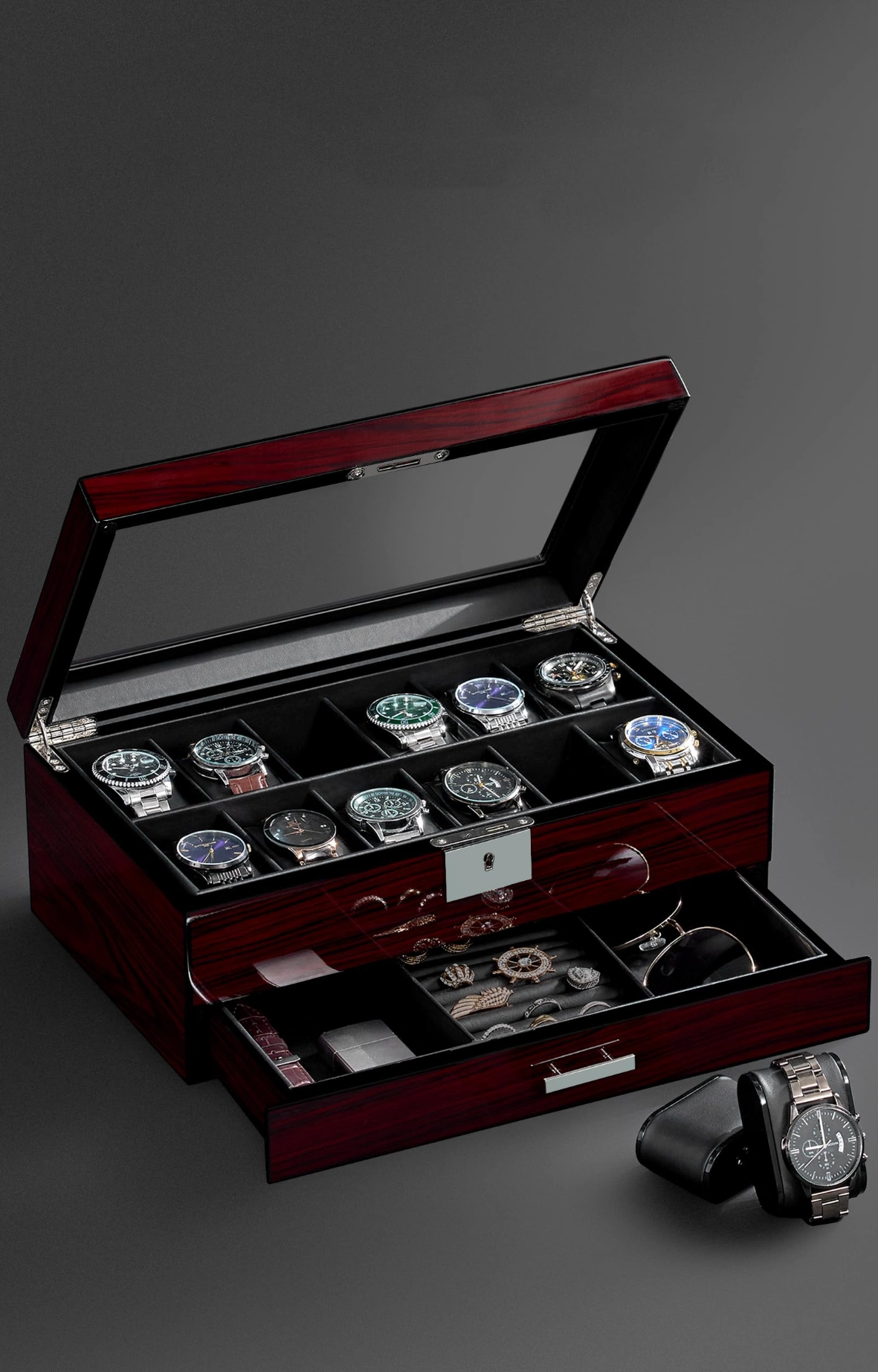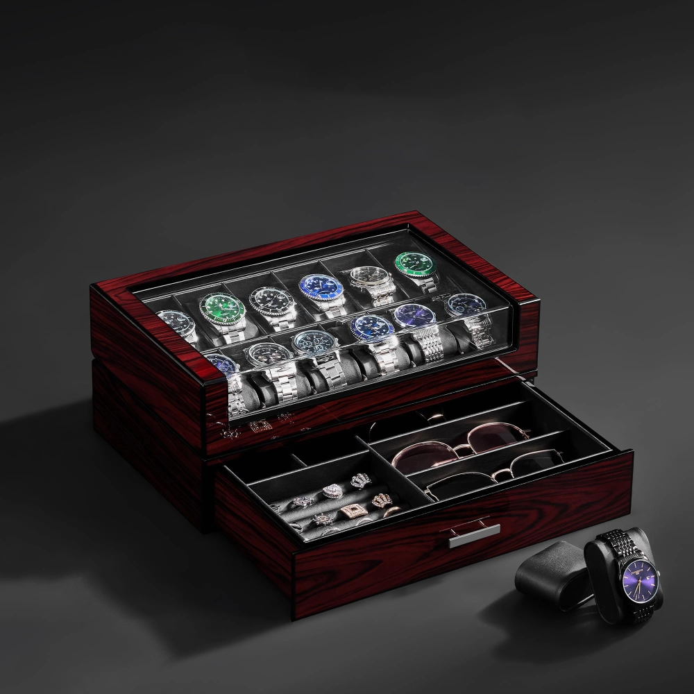 Luxury watch storage case with 12 slots, glass lid, 2-layer design, and faux leather lining. Perfect jewelry and watch organizer, ideal as a gift for men or women.