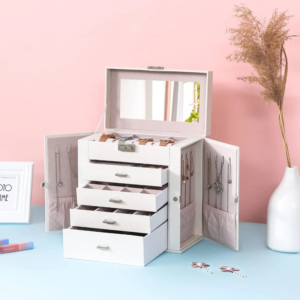 Spacious jewelry organizer for women and girls, featuring sturdy design with drawers, mirror, and secure lock. Perfect for keeping jewelry tidy and protected.