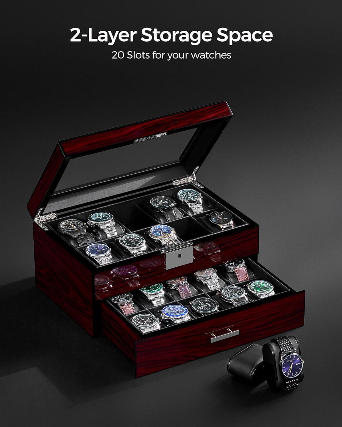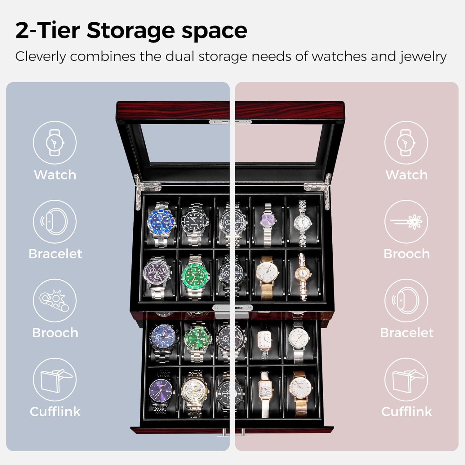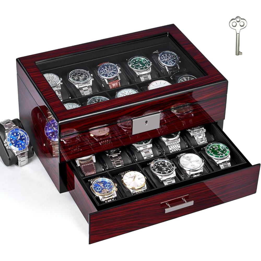 20 SLOT WATCH DISPLAY CASE: Watch box size: 11.9 “L x 8” W x 6 “H (30.2 x 20.3 x 15.3cm), watch pillow size: 2.8” L x 2 “W (7.2 x 5 cm).This men's watch case is made of wood has 20 watch slots on the upper layer, Jewelry compartments on the lower layer, and a large glass lid.It holds your watches collection very well and keeps your jewelry(chunky rings and bracelets and tie pins)organized.