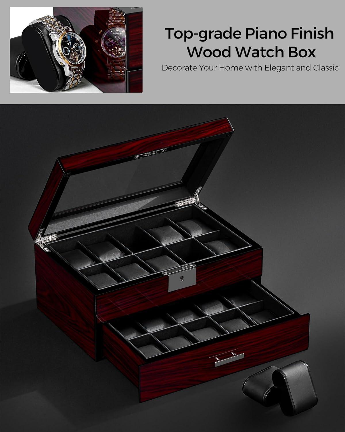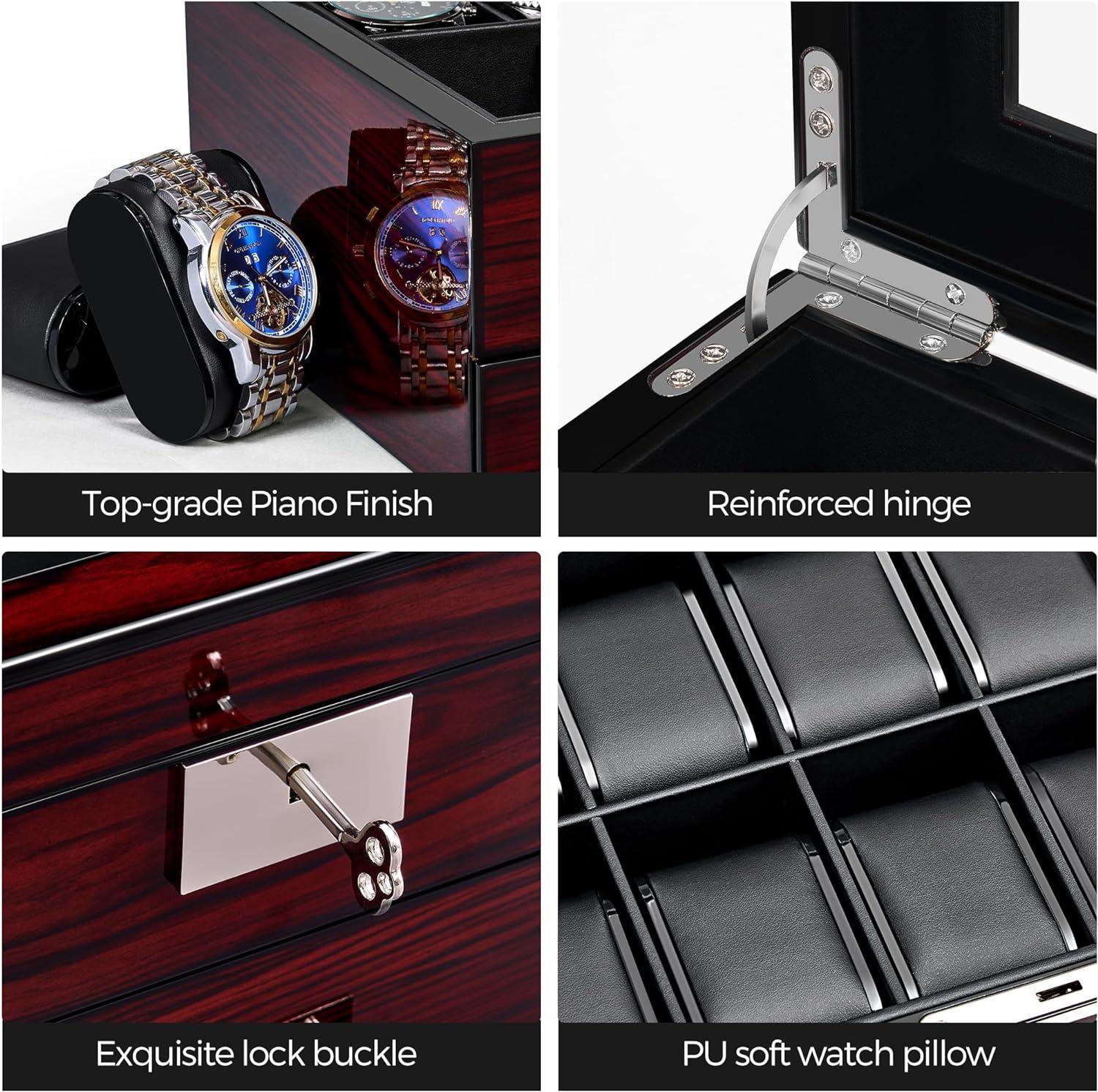 ATTRACTIVE WATCH BOXES:The watch box's sleek and sophisticated design adds a touch of luxury to your watch collection, The wood grain and piano lacquer craftsmanship and super quality soft PU lining make it look luxurious and charming.The beautiful hardware buckle makes it more exquisite