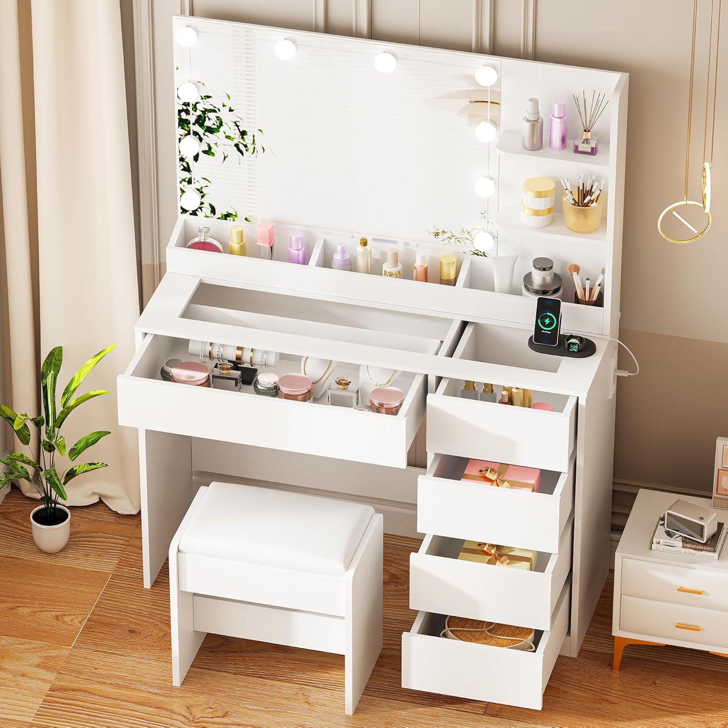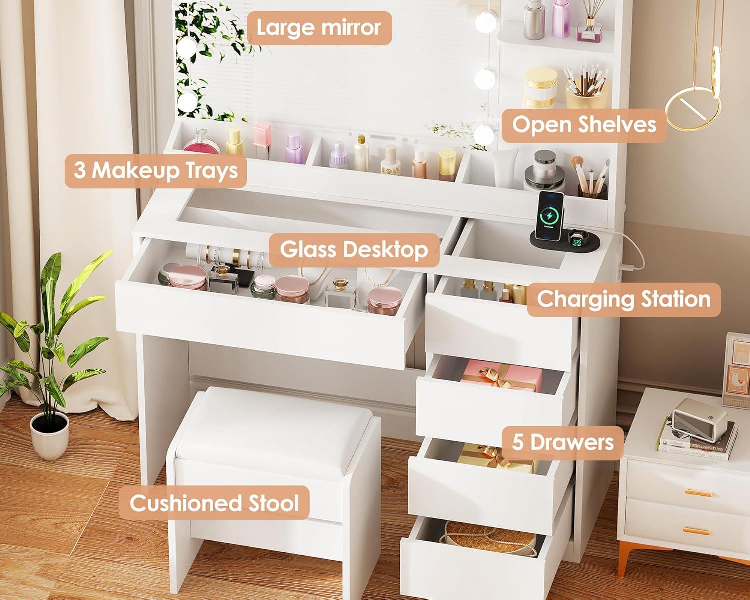 LARGE STORAGE CAPACITY: The makeup vanity with lights includes 5 large drawers, 2 open storage shelves and 3 makeup trays; All your cosmetics and skin care products can be sorted and stored tidily to the vanity table; You can say goodbye to the small and messy table and enjoying a better life with our vanity for small space