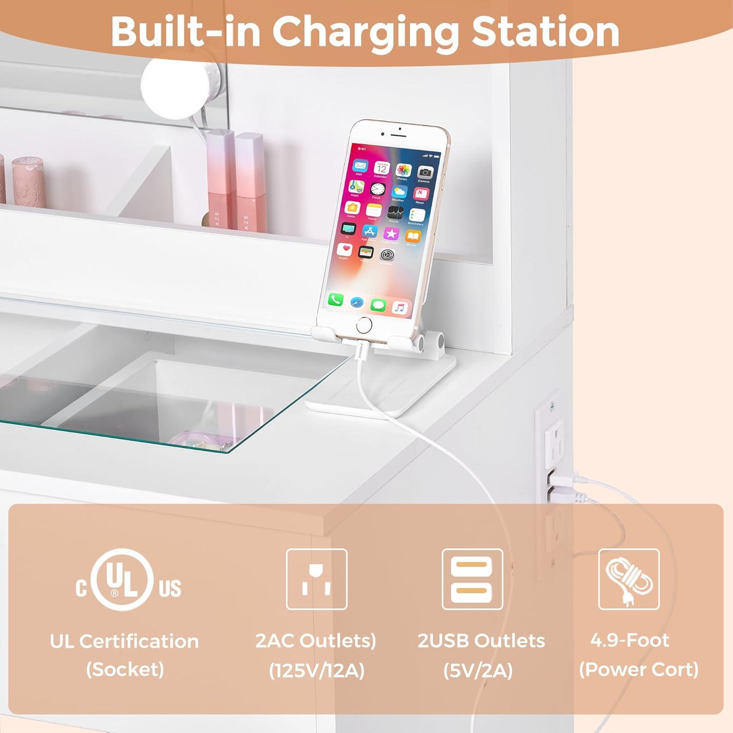 EQUIPPED WITH CHARGING EQUIPMENT: White vanity with lighted mirror comes with 2 standard power outlets and 2 USB ports; White vanity with outlet can charge hair dryers, beauty instruments and other electronic devices and makes your makeup more convenient and efficient