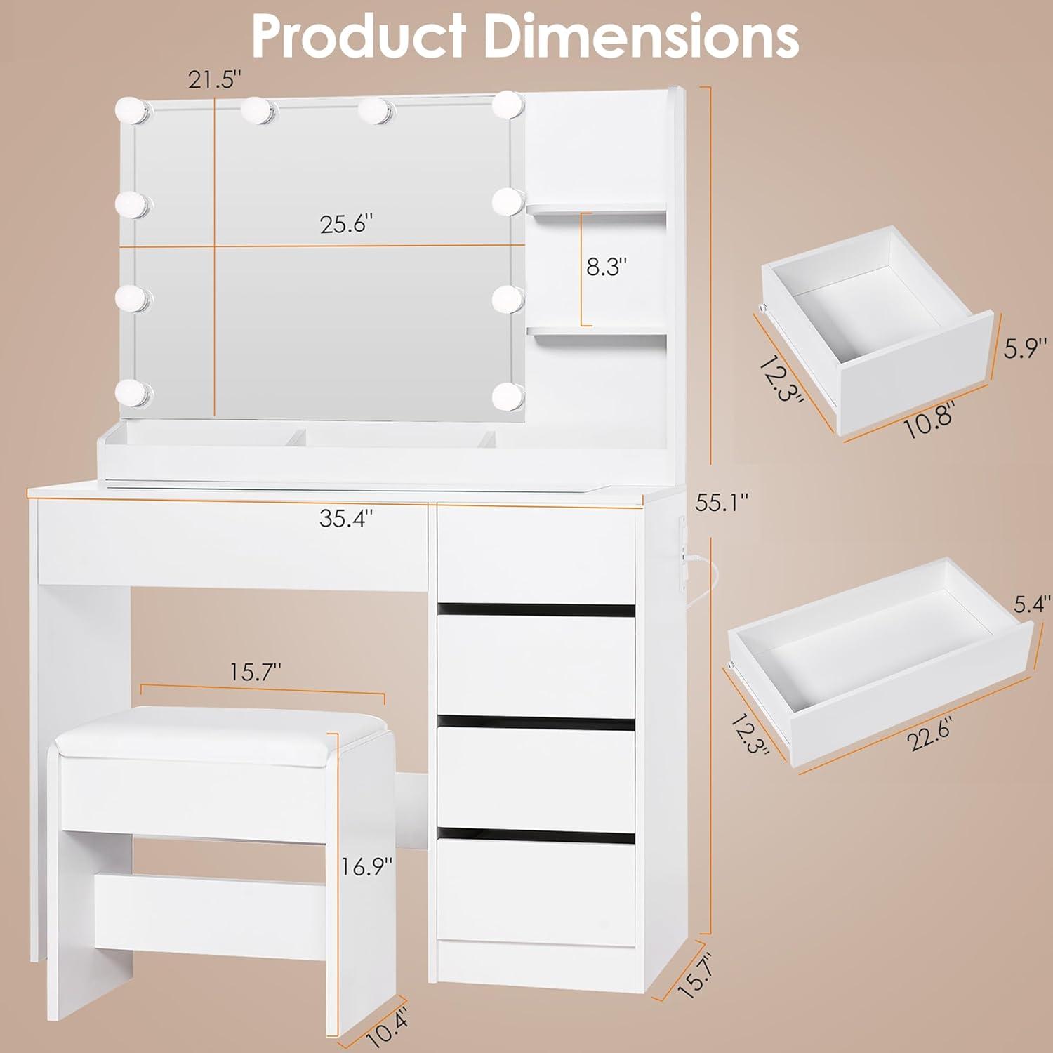 STURDY AND STYLISH: Vanity overall dimensions: 15.7″D x 35.4″W x 55.1″H; Cushioned stool dimensions: 10.4″D x 15.7″W x 16.9″H; Made of sturdy materials, sturdy table and bench legs, premium silence drawer slide, easy-to-clean PU leather; This classic girls vanity set with mirror and stool and lights decorates yours home and bedroom more warm and comfortable