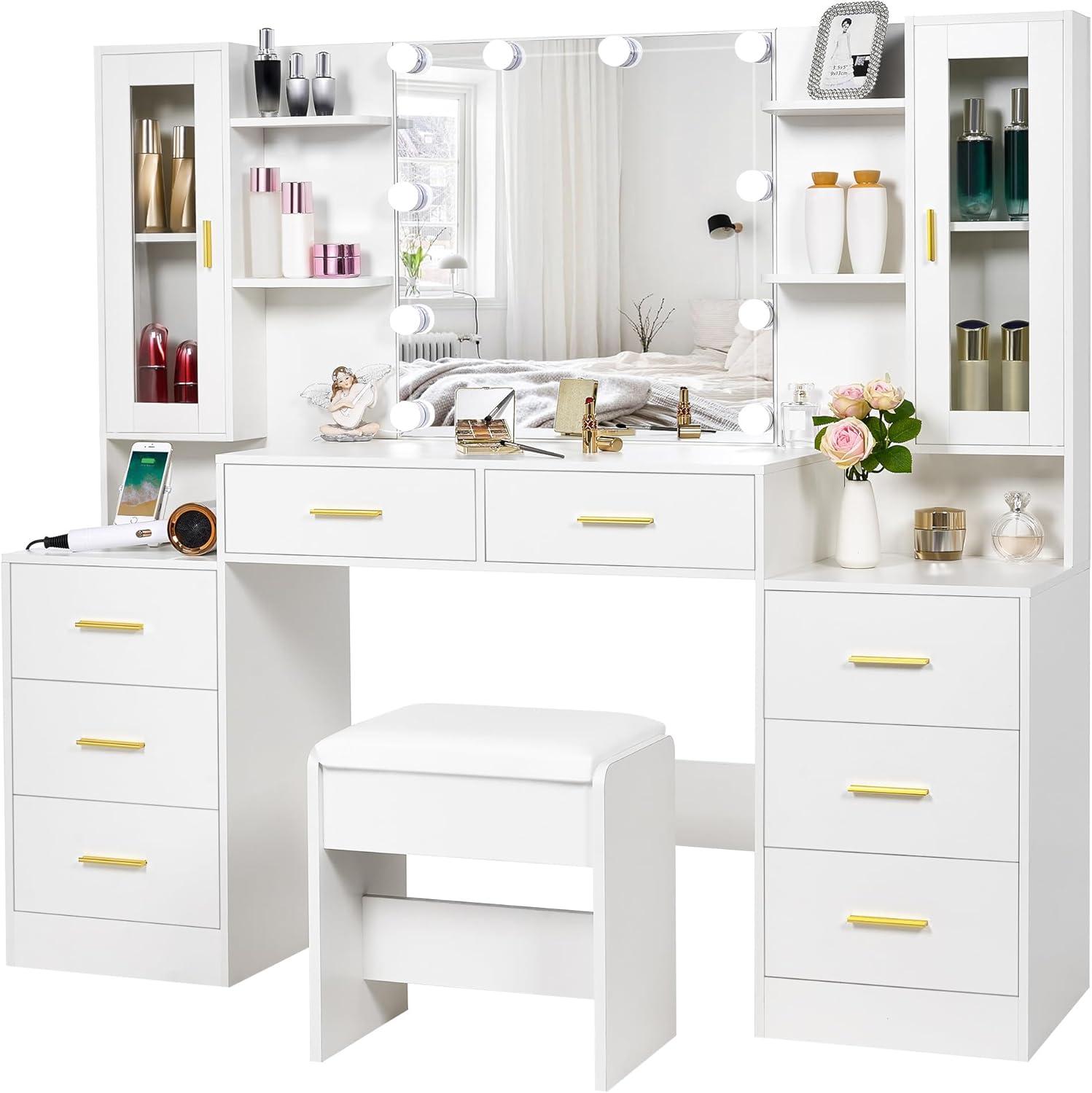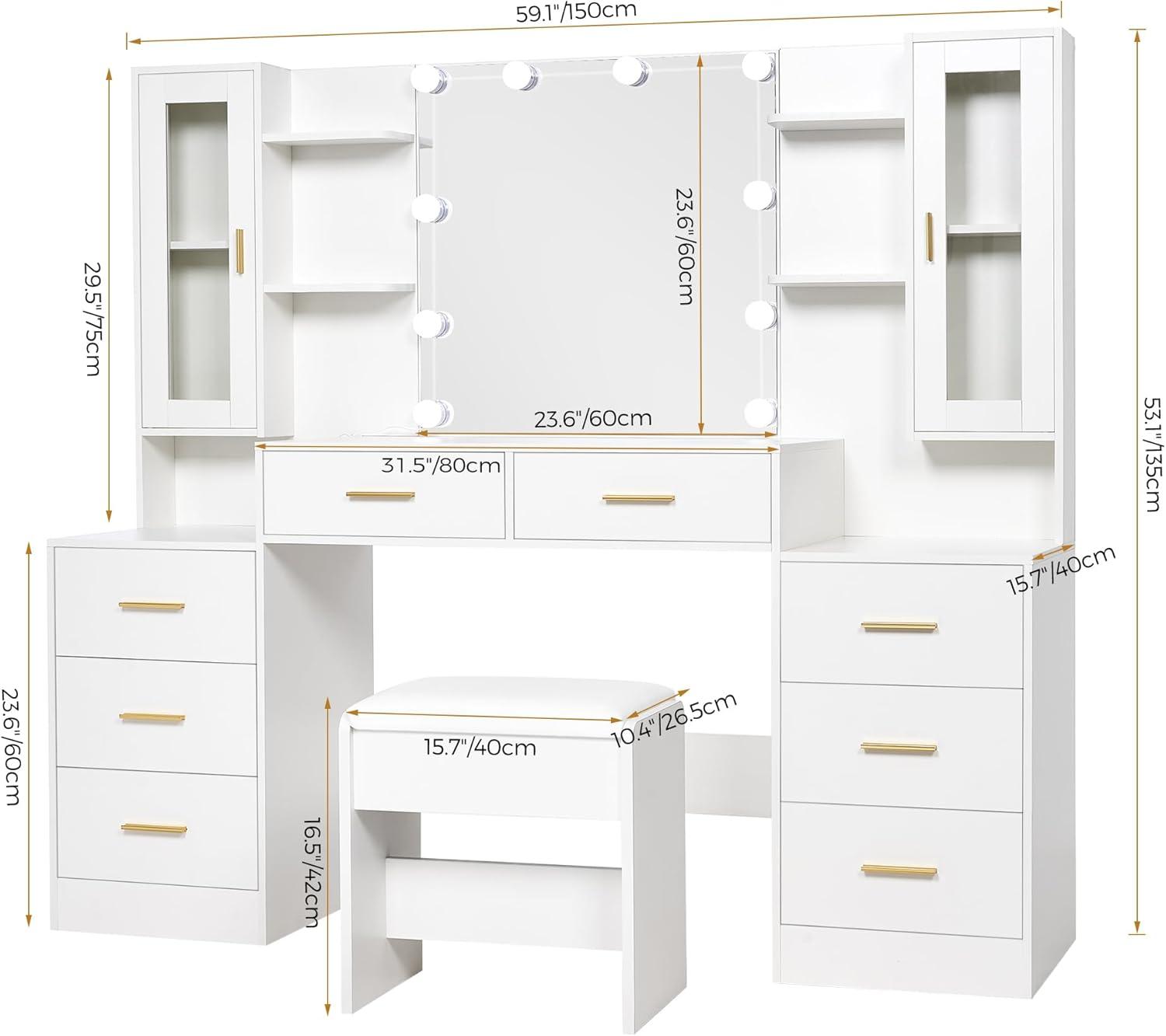 【LARGE VANITY DESK WITH 8 DRAWERS】The makeup vanity set also contains 8 drawer chests,6 Storage Shelves and a large countertop. All your cosmetics and skin care products can be sorted and stored tidily to the vanity table. You can say goodbye to the small and messy table and having a better life with our big white vanity desk with mirror and lights