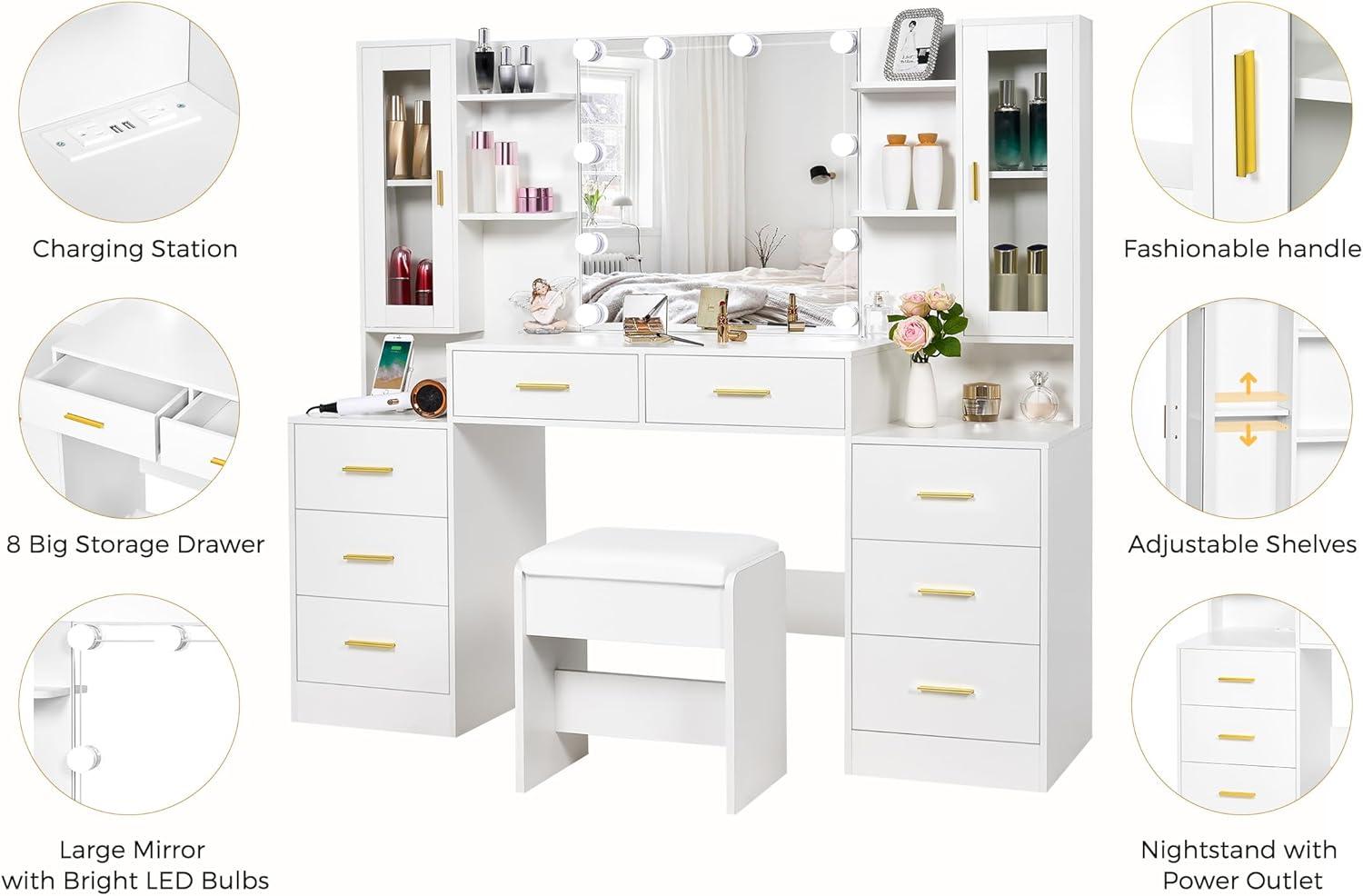 【VANITY DESK WITH LED LIGHTED MIRROR】This modern large makeup vanity set has an LED illuminated vanity mirror, which have adjustable brightness and 3 lighting modes. 10 LED dimmable bulbs provide your best beauty station with sufficient and adjustable brightness, by which you can view your makeup details in various lighting situations. LED lights also protect your eyes