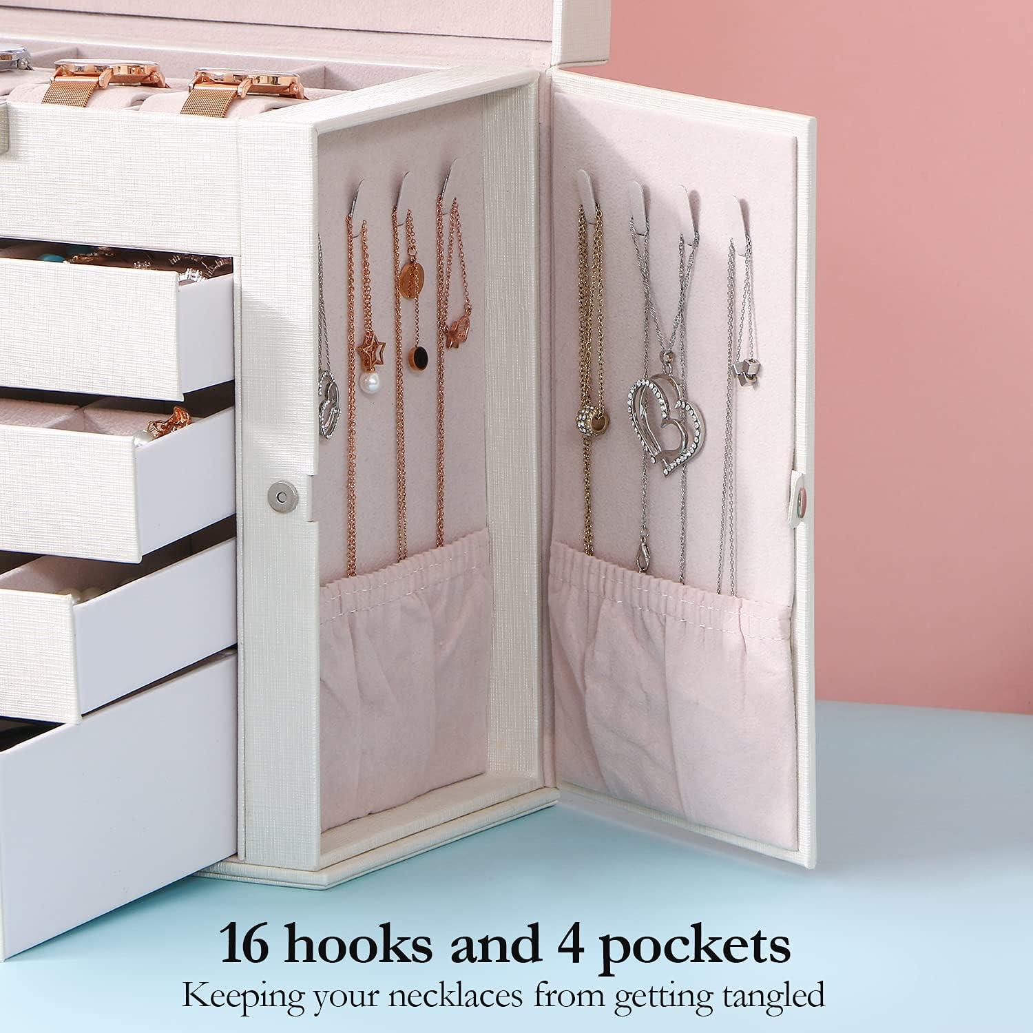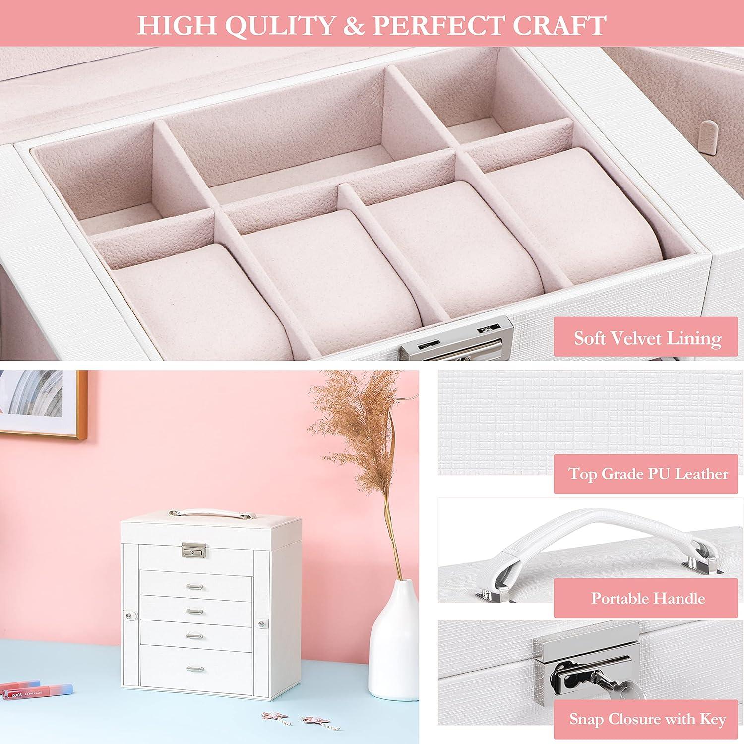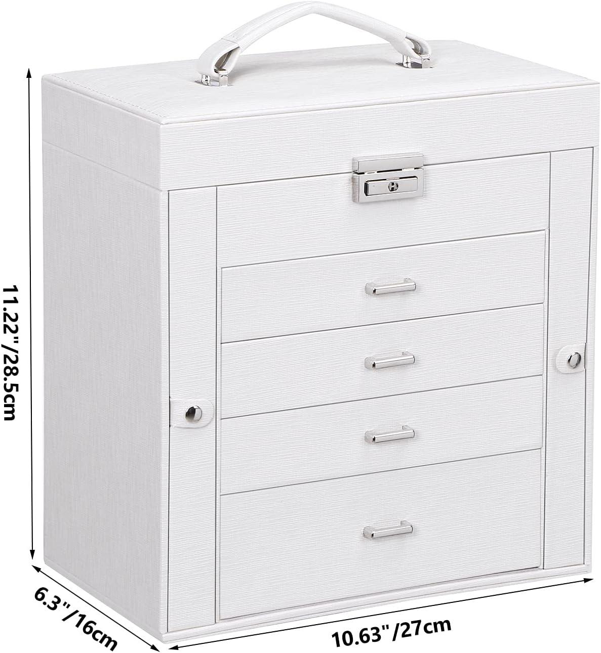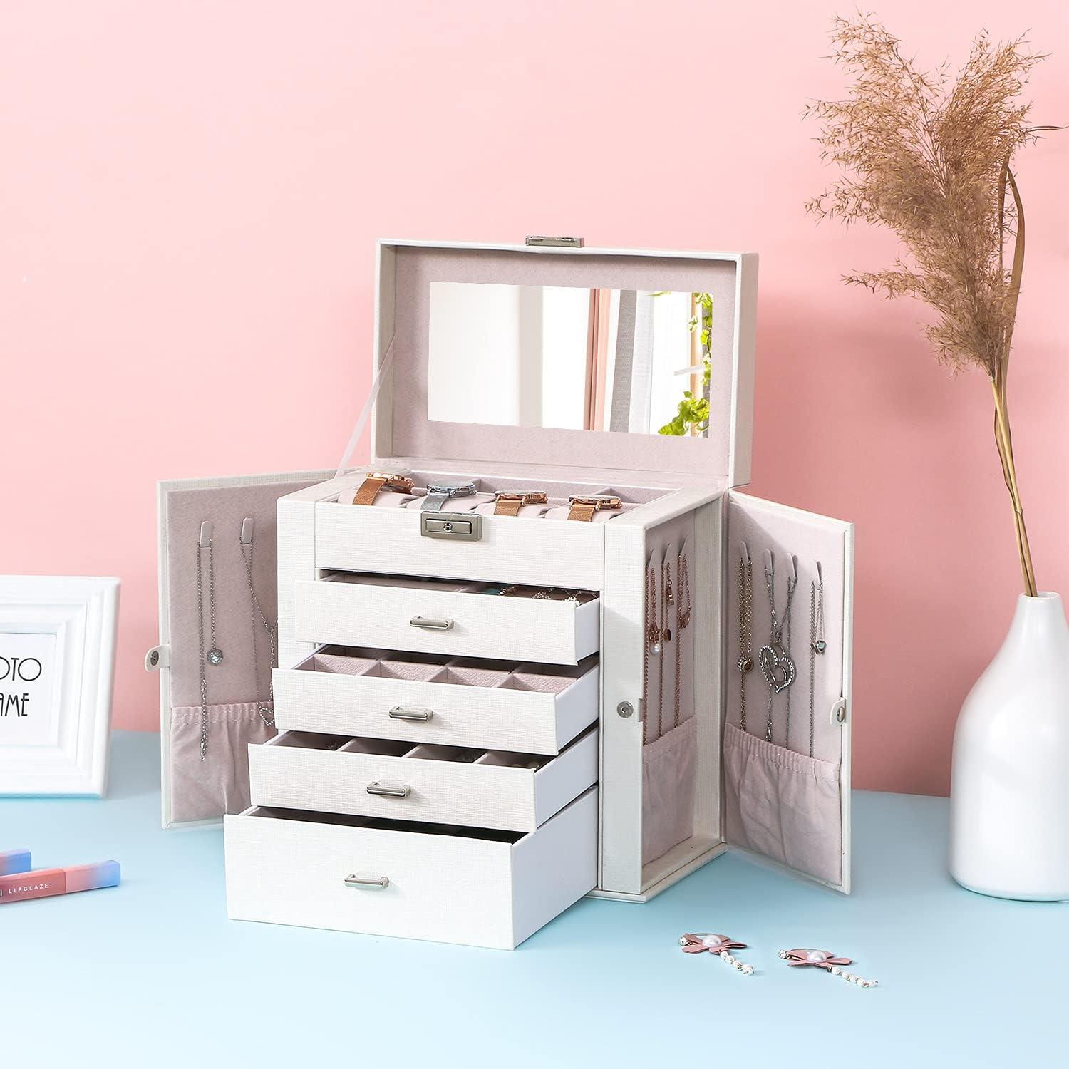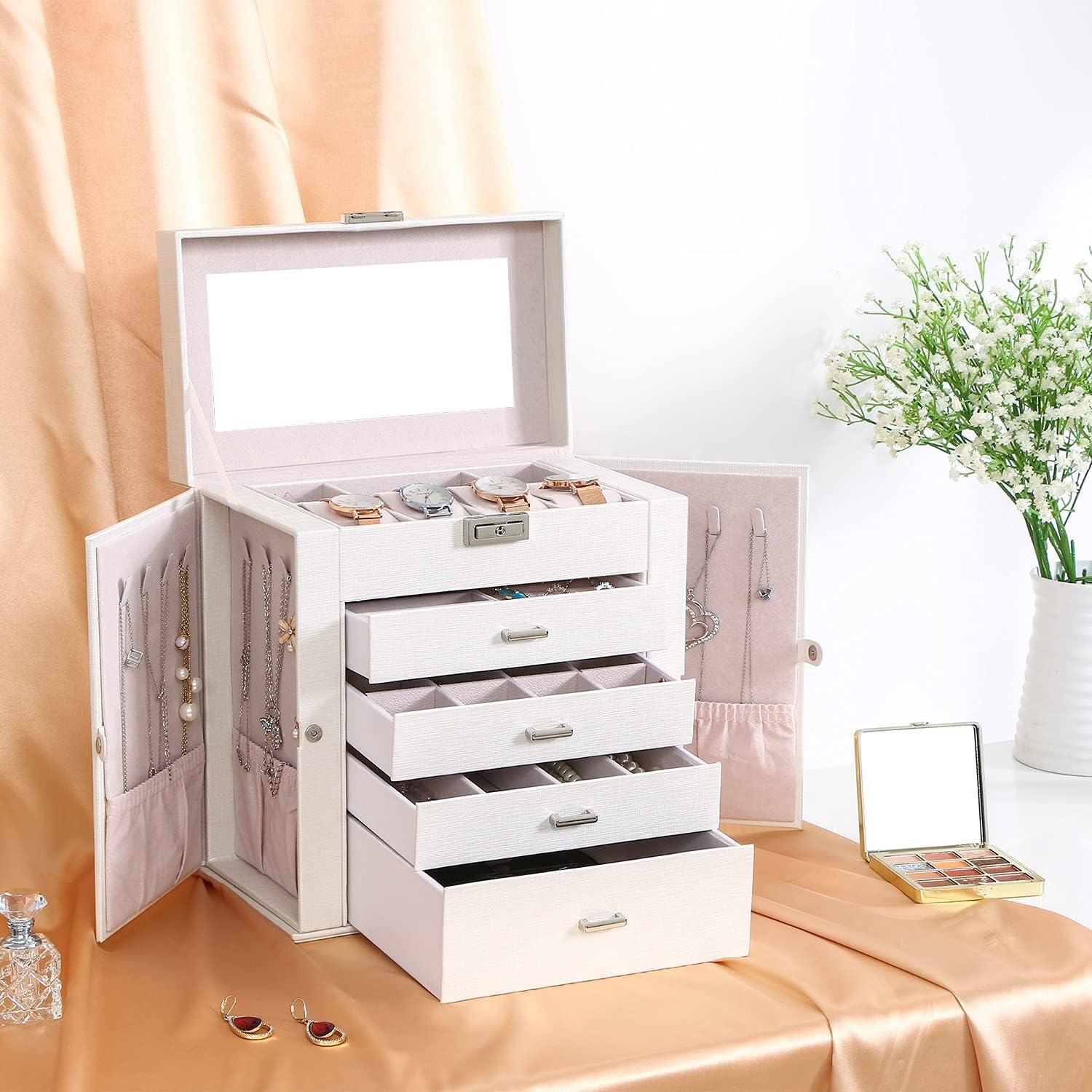 LARGE CAPACITY JEWELRY BOX:5-tier and 2-wings can organize all your jewelry. The top layer with lock and mirror to store valuable jewellery. Contains 4 pillows, 4 earring grids and 7 ring cushions, 12 equal-sized squares, one large sunglasses grid. The middle 3 layers can be interchanged