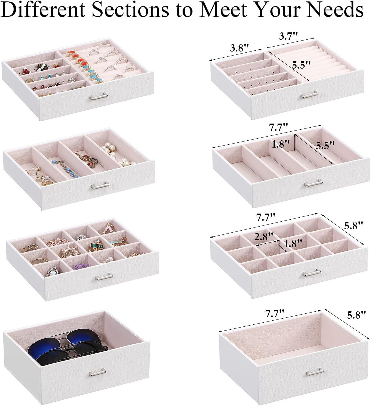 MULTI-FUNCTIONAL JEWELRY ORGANIZER:The jewelry box It can be put a couple watches, earrings, rings, necklaces, hairpins,brooches, bracelets, and some sunglasses distributed into all the drawers. Avoid jewelry tangle and loss and tarnish in the air, keep your desktop neat and clean