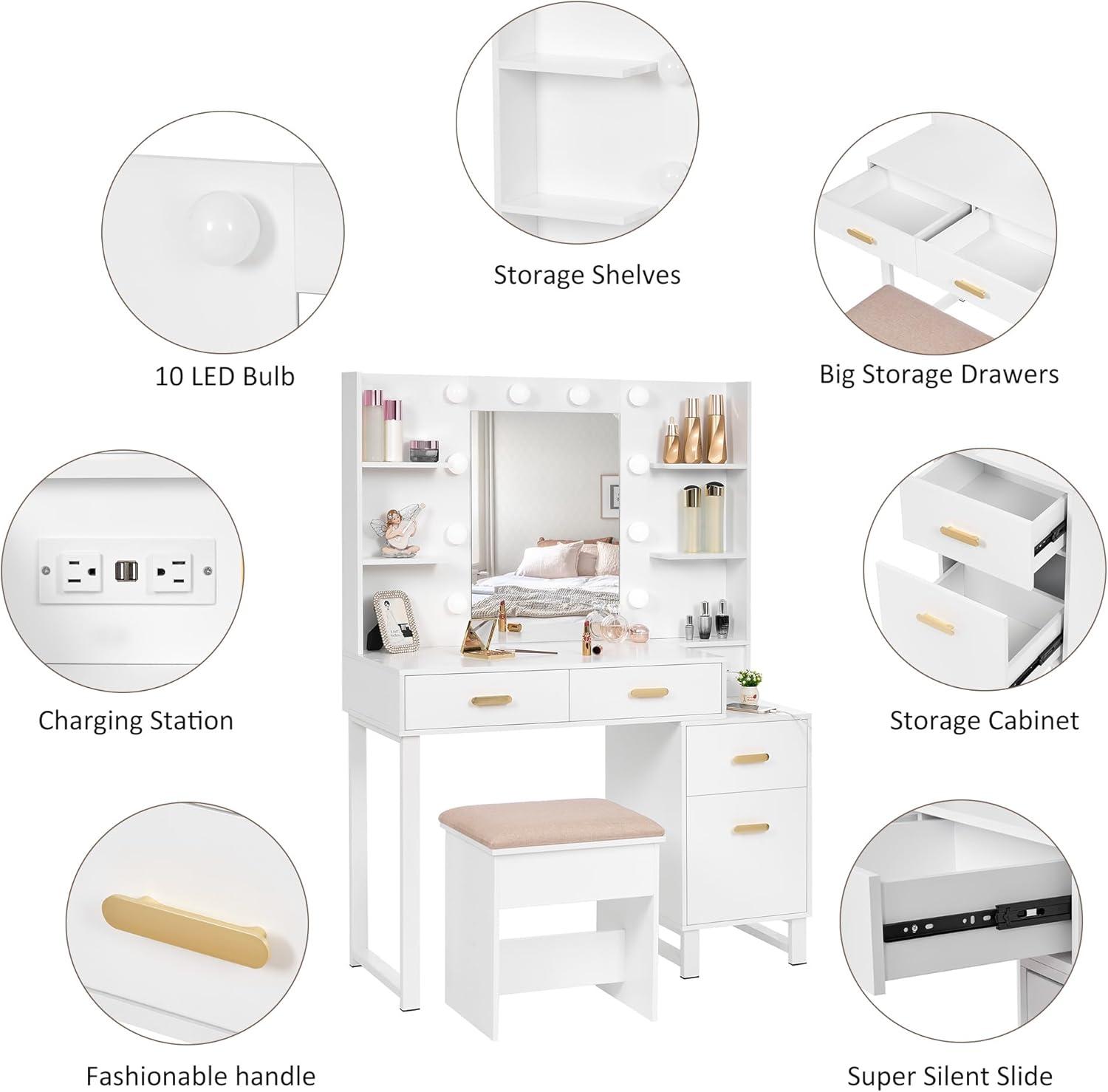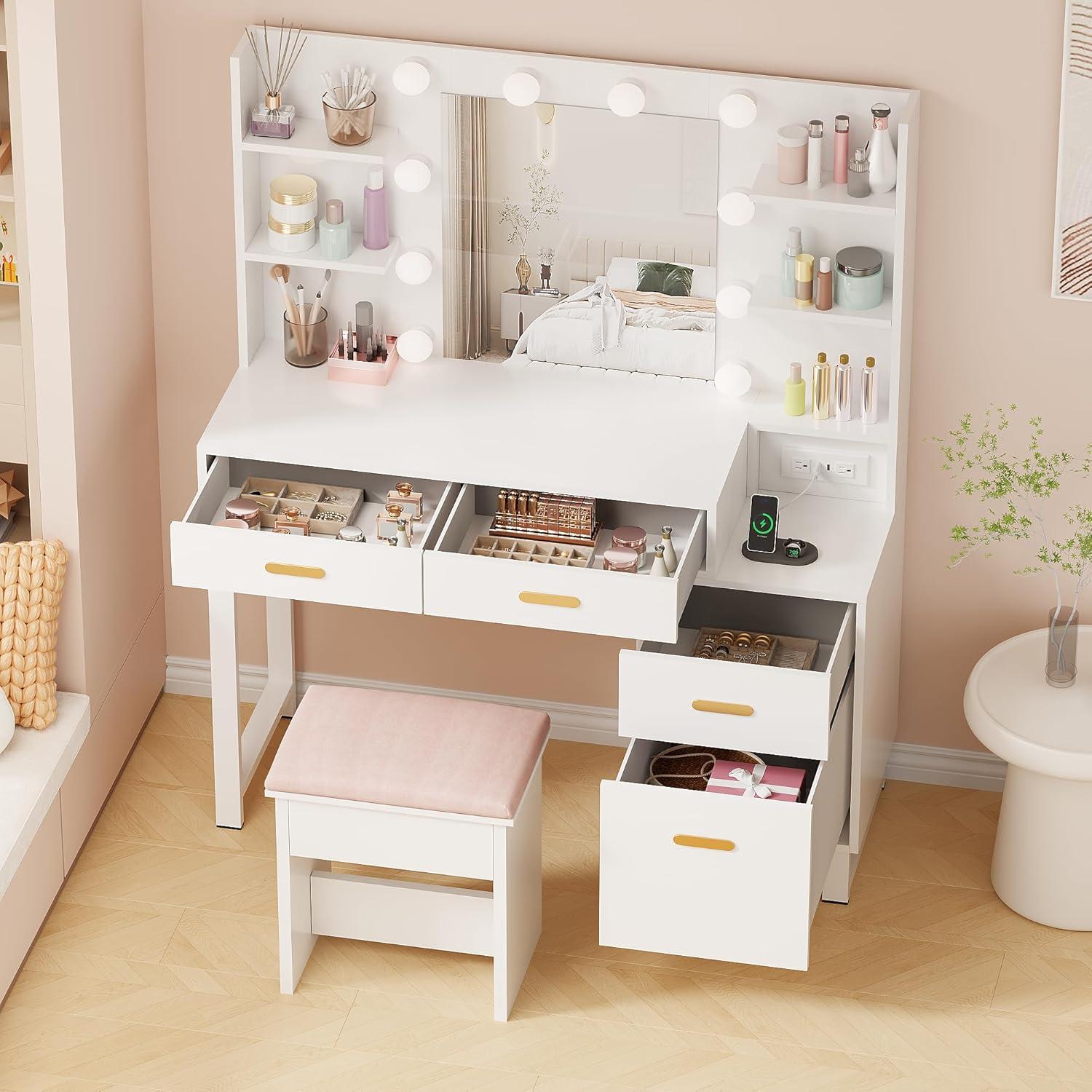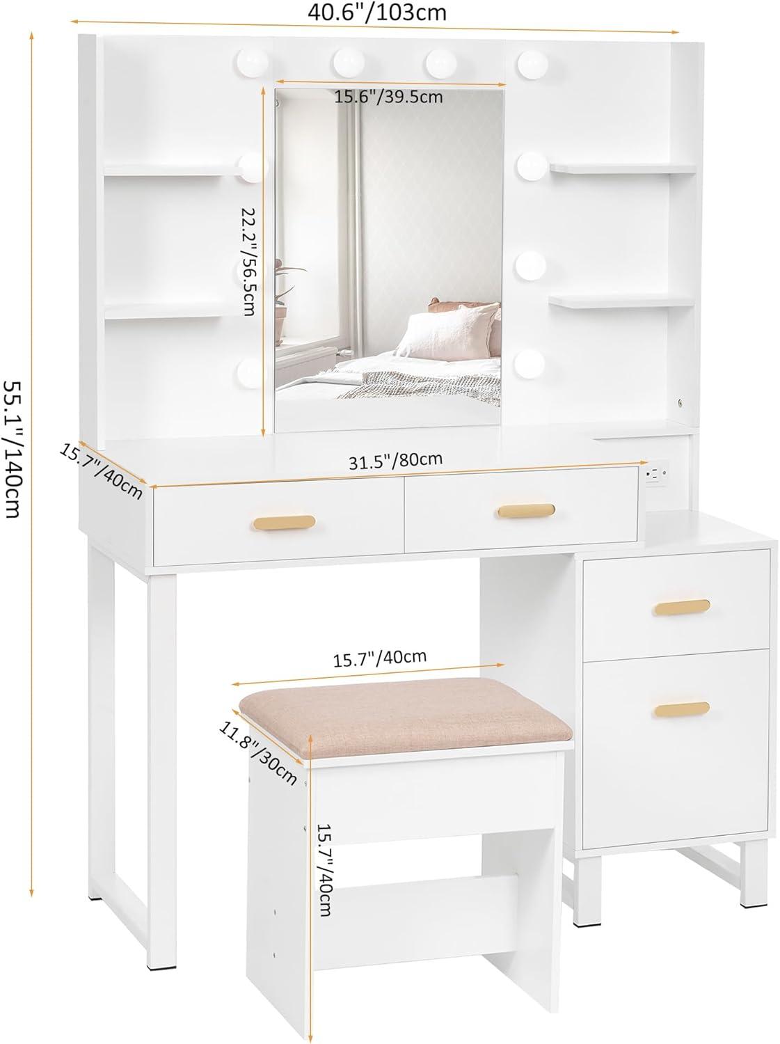 【CHARGING STATION WITH NIGHTSTAND】This makeup vanity set comes with 2 standard power outlets and 2 usb ports. It is very convenient for your phone, table lamp, hair dryer and so on. This makeup vanity desk also is designed with a nightstand offer you with enough space to store your makeup, everyday jewelry, perfume collection, lotions, brushes, hair accessories and other beauty supplies
