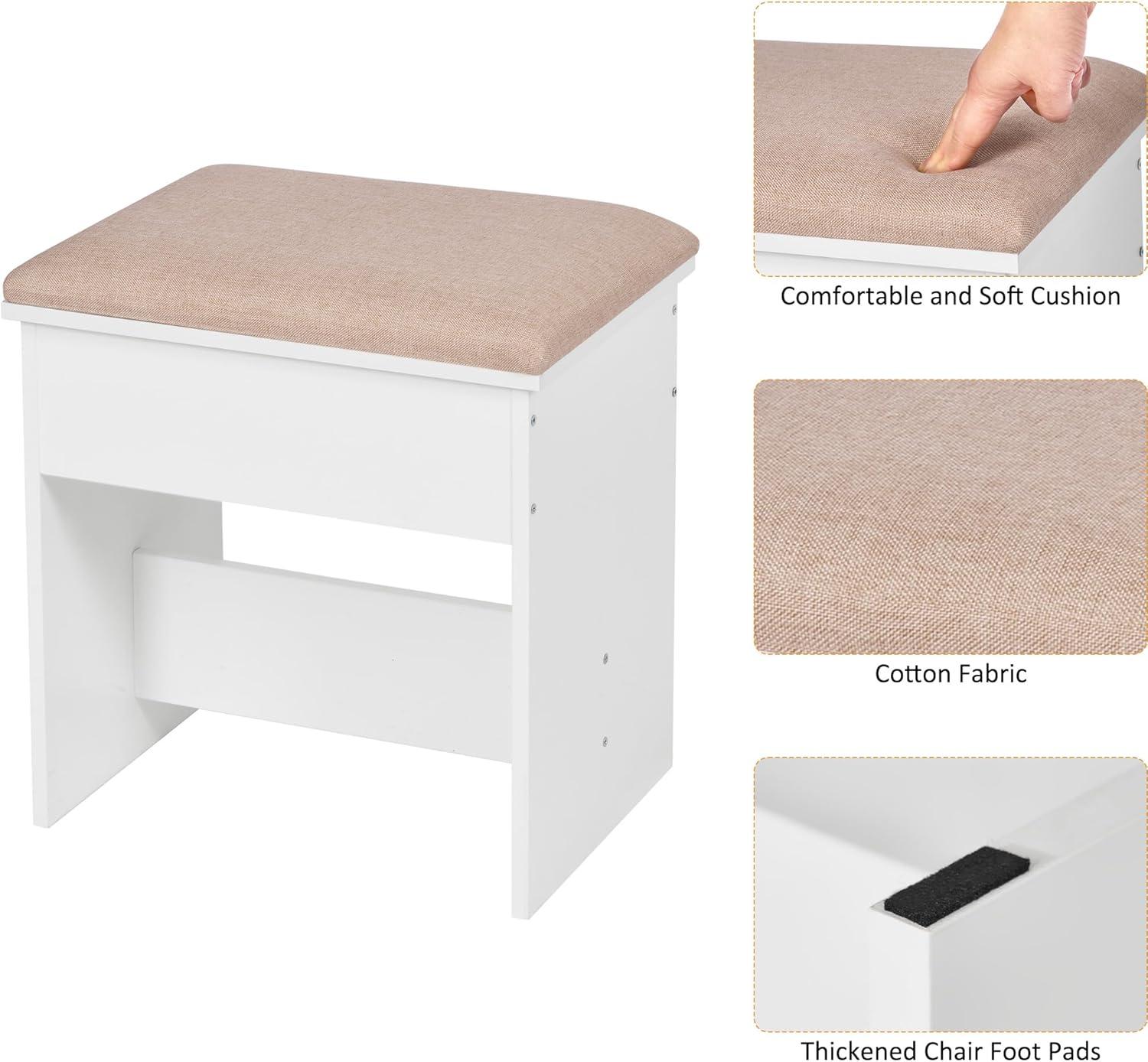 【ELEGANT & FUNCTIONAL DESIGN】Simple and elegant design with large mirror, fashion gloden handle and studry legs, this dressing vanity table and stool set can be a functional and sturdy piece of furniture to your bedroom, bathroom, closet or hallway. Cushioned seat offer you a comfy place to do your makeup and hair. This makeup desk set will be an ideal VANITY option for your girl on Valentine's Day, Mother's Day or Christmas