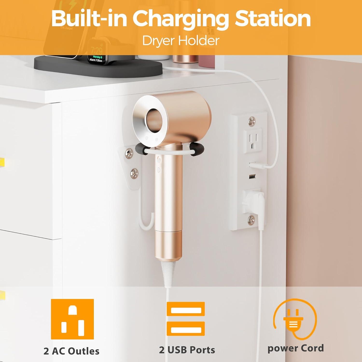 Vanity Table with Charging Station & HAIR DRYER RACK: Large vanity desk with mirror comes with 2 standard power outlets and 2 USB ports; It can charge hair dryers, cell phones and other electronic devices at the same time and makes your makeup more convenient and efficient