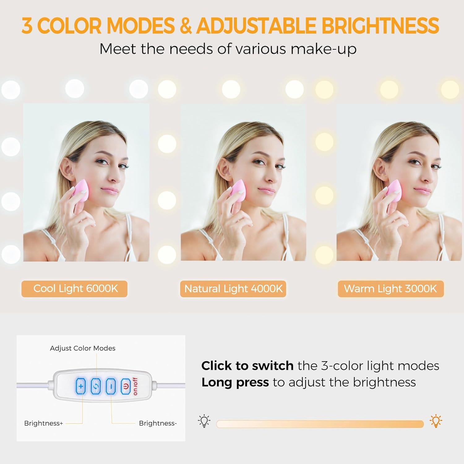 Large Mirror with 3 Color Lighting Modes: This vanity mirror with lights has adjustable brightness and 3 lighting modes, touch the switch to turn off or adjust the modes: (warm, natural, cool), touch to adjust the brightness; Dressing up in front of such a multifunctional modern white vanity with lighted mirror can create a good mood