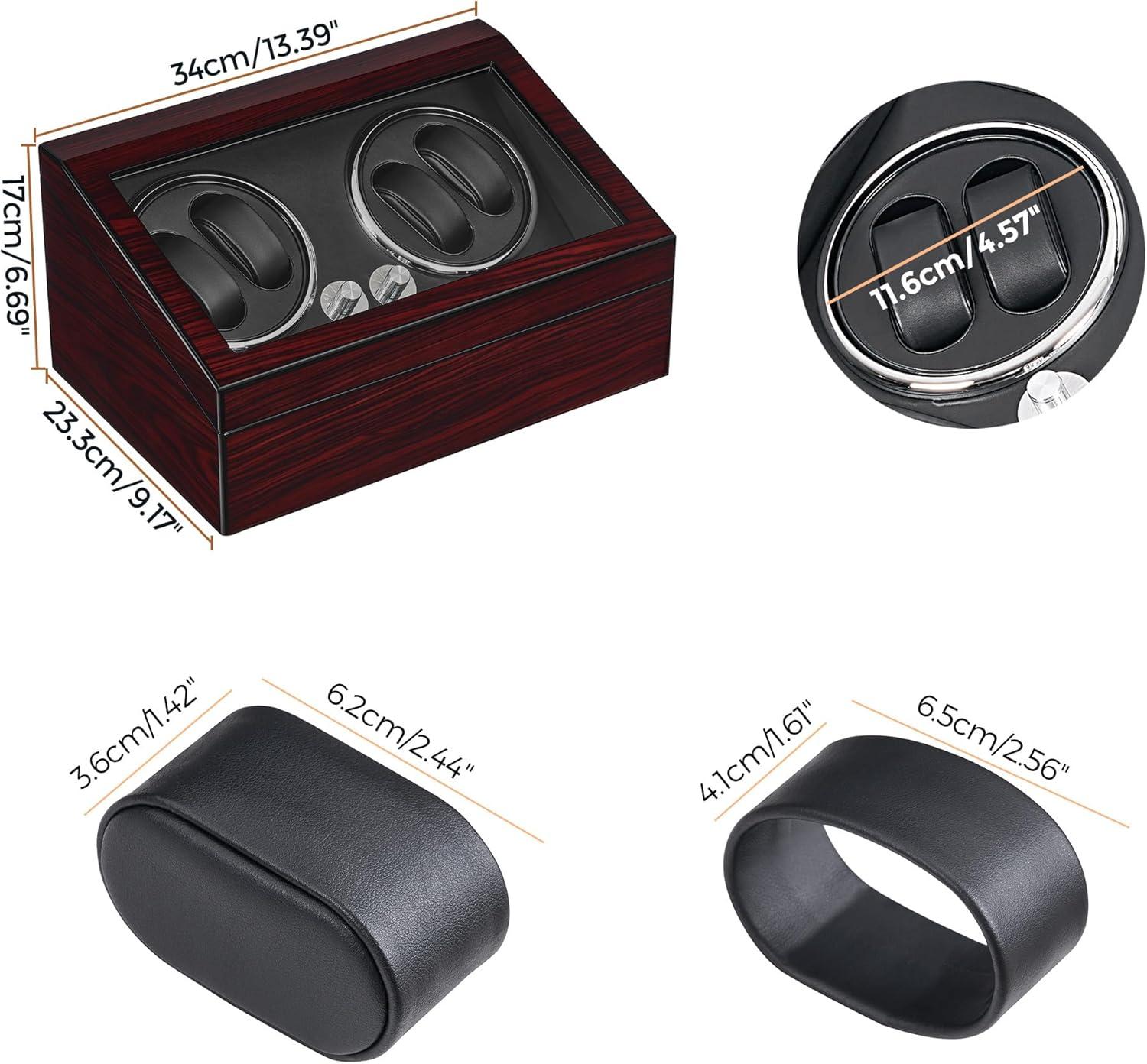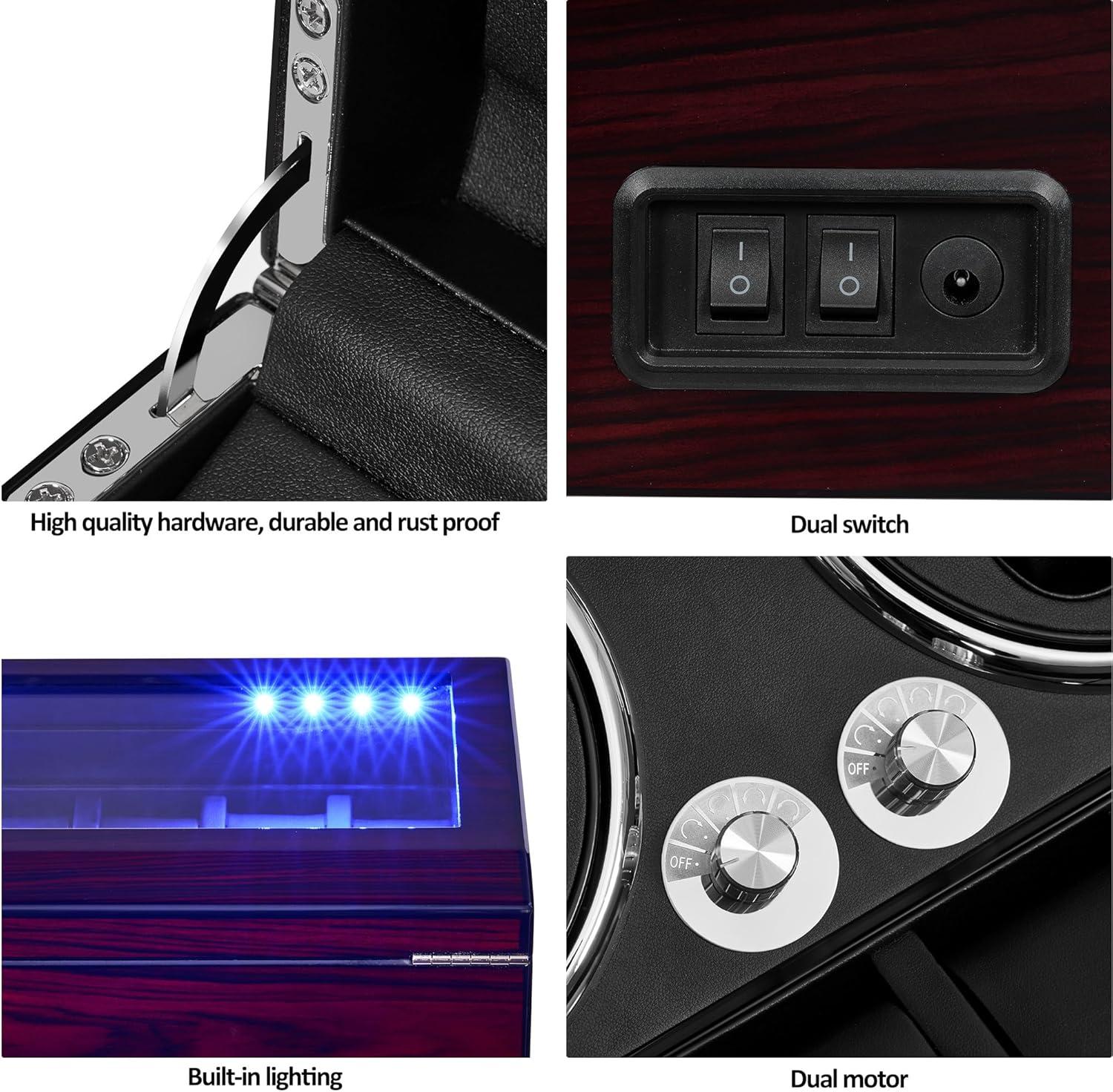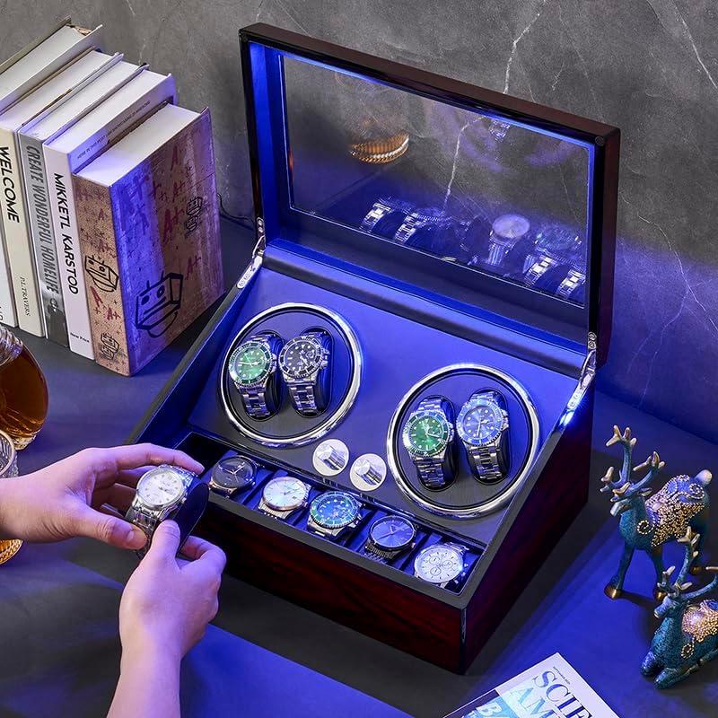 LUXURY WATCH SHAKER: The surface is treated with piano paint technology, elegant and luxurious. Product size 13.39”L X 9.17”W X 6.69”H. The design of opening the cover and stopping rotation is very thoughtful. Ant-magnetic keep your watch safe and running very precision. Built-in LED backlight enhances the display atmosphere