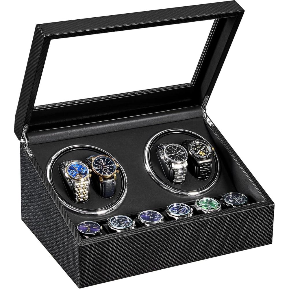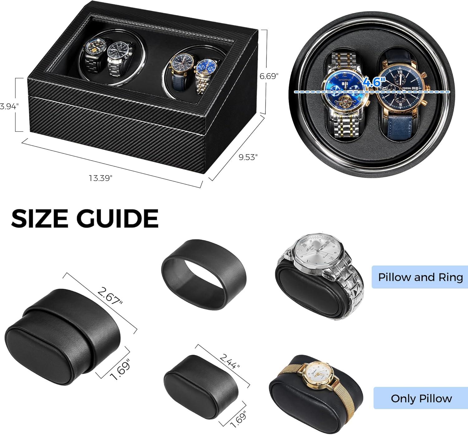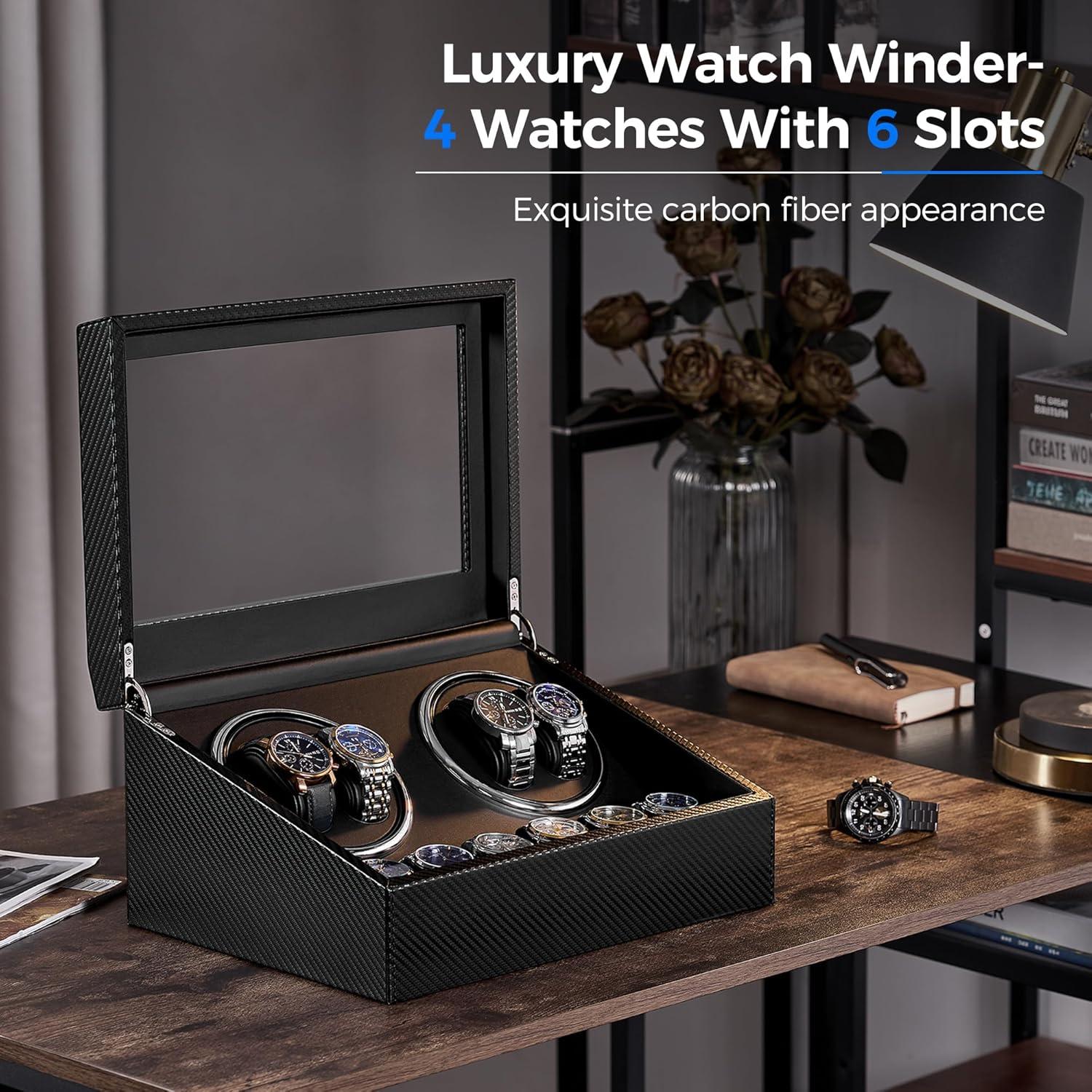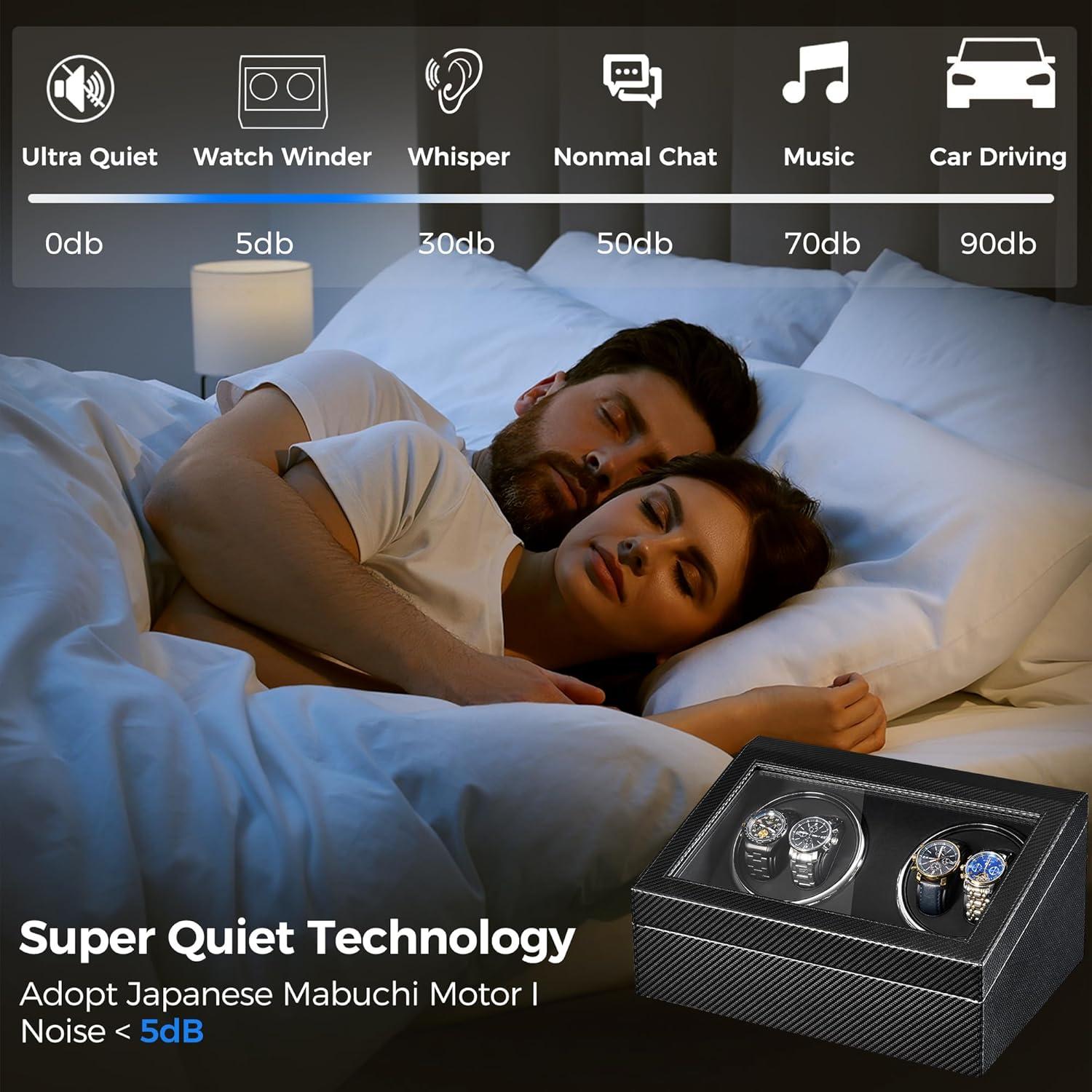 【Carbon fiber light luxury appearance & Silver ring decoration】Watch Winders for Automatic Watches adopt a modern carbon fiber texture appearance, it showcases a low-key luxurious taste.Decorated with exquisite silver metal rings,the details are meticulous, adding a touch of the blend of technology and fashion to your desktop or display cabinet