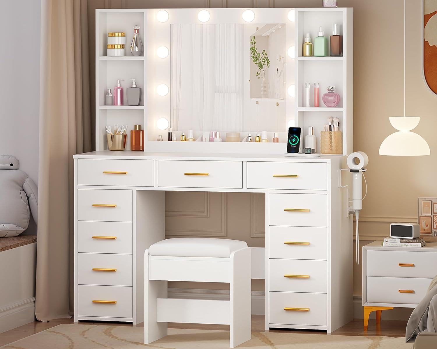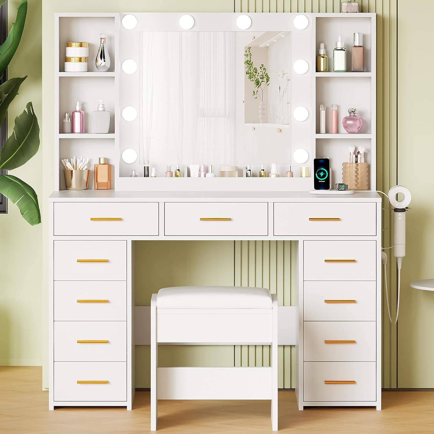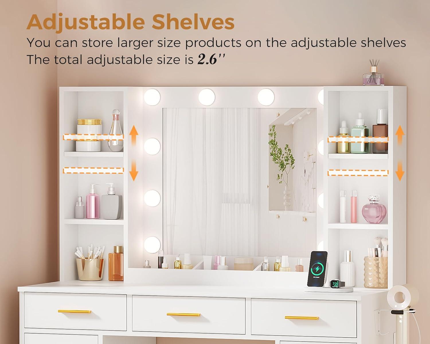 【11 DRAWERS & LARGE STORAGE CAPACITY】: Are you still worried about not having enough storage for your cosmetics? This vanity desk is designed specifically for you. It has 11 spacious drawers, 6 shelves and 3 makeup storage compartments, providing ample storage space for all your beauty products and keeping your makeup area organized. The vanity desk with mirror and lights comes with 2 adjustable shelves that you can move up and down for more space. You can say goodbye to the small and messy table and enjoy a better life
