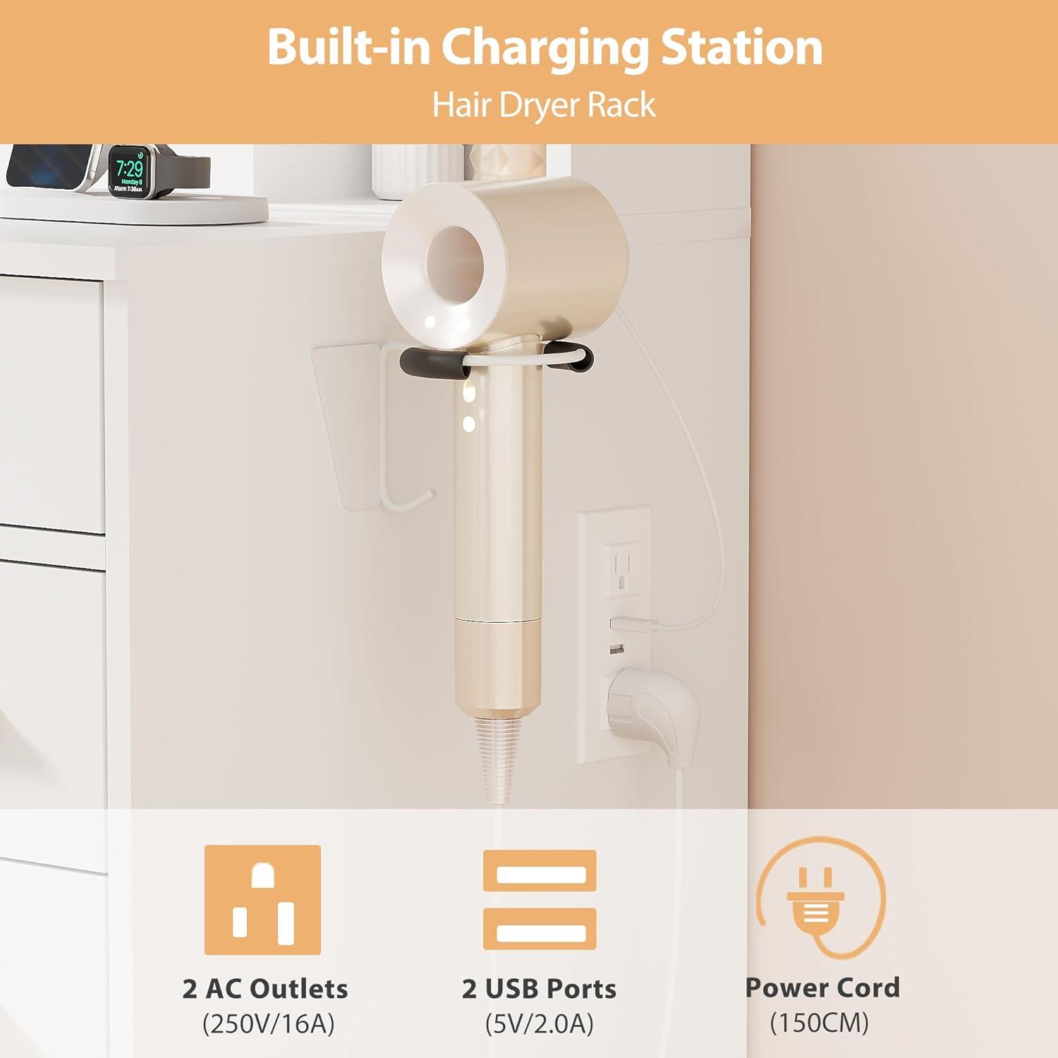 【MAKEUP TABLE WITH CHARGING STATION】: This Large vanity with led lights comes with a hair dryer stand and charging station; including 2 standard plug sockets and 2 USB ports to connect your hair dryer, curling iron, computer, and can also provide power for your mobile phone, tablet or other devices to charge your mobile device, allowing you to take beautiful selfies after applying makeup. Nice girls vanity for dressing room, salon or your bedroom