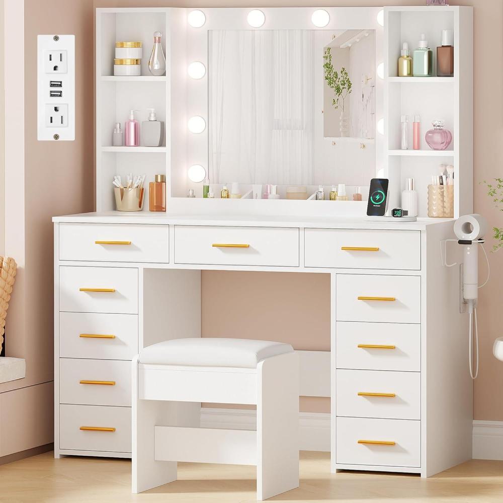ANWBROAD White Vanity Desk with Large Mirror & Multiple Drawers & Charging Station is a stylish and functional piece of furniture for your home, and it designed to blend harmoniously with a variety of interior styles. You can easily see your entire makeup details when you do makeup whether it's during the day or at night with the lighted mirror. With hair dryer stand and charging station, you can charge your phone, desk lamp, or hair dryer freely and simultaneously. This vanity set features 11 large drawers, 6 shelves and 3 makeup storage compartments that can provide ample space for your beauty supplies, jewelry, hair accessories, etc. The cushioned seat offers you a comfortable place to do your makeup and hair. The vanity with lights looks very contemporary and elegant. It is really an ideal gift for your loved one on Valentine's Day, Mother's Day, or Christmas Day. Specifications: – Main Color: White – Material: Engineered Wood – Vanity Table Dimensions: 15.75″D x 43.3″W x 55.12″H – Vanity Mirror Size: 22.04″W x 19.3″H – Vanity Stool Dimensions: 10.62″D x 15.75″W x 15.75″H – Some simple assembly required Package Contents: – 1 Vanity Table – 1 Mirror with 10 LED Lights – 1 Cushioned Stool – 1 Assemble Instruction